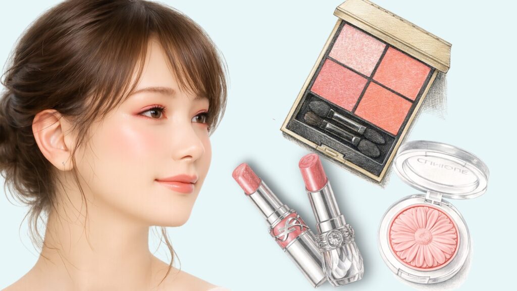 例えばチーク。青みの強いピンクではなく、コーラルやアプリコット系を選ぶと、頬に自然な血色が生まれます。ふんわりと頬の内側に入れるだけで、顔全体が柔らかく明るい印象になります。